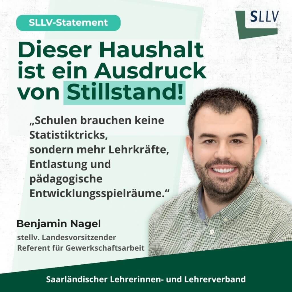 Pressemitteilung vom 26.11.25: Stillstand in der Bildungspolitik – Saar-Haushaltsplan ohne Signal für Entlastung und Bildungsperspektive Der Saarländische Lehrerinnen- und Lehrerverband (SLLV) zeigt sich vom aktuellen Bildungshaushaltsplan für die Jahre 2026/2027 der Landesregierung äußerst ernüchtert. Trotz leicht steigender Gesamtausgaben fehlt dem Entwurf jede bildungspolitische Ambition. „Dieser Haushalt ist kein Aufbruch, sondern Ausdruck von Stillstand“, so der stellvertretende Landesvorsitzende und Referent für Gewerkschaftsarbeit, Benjamin […]